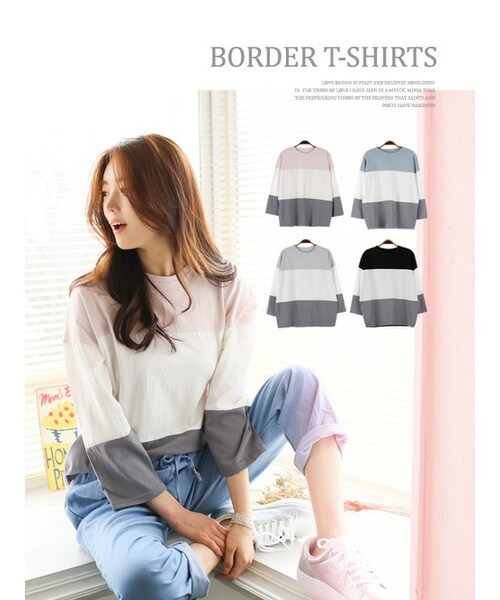 【3段配色コットンTシャツ。】ベーシックなTシャツが3色に表現!ゆるっとしたTシャツが女らしいお色で可愛くコーデ完成!太めの糸を使用し暖かく3段配色と共に編地変化がポイントのトップスですレースカーデです。