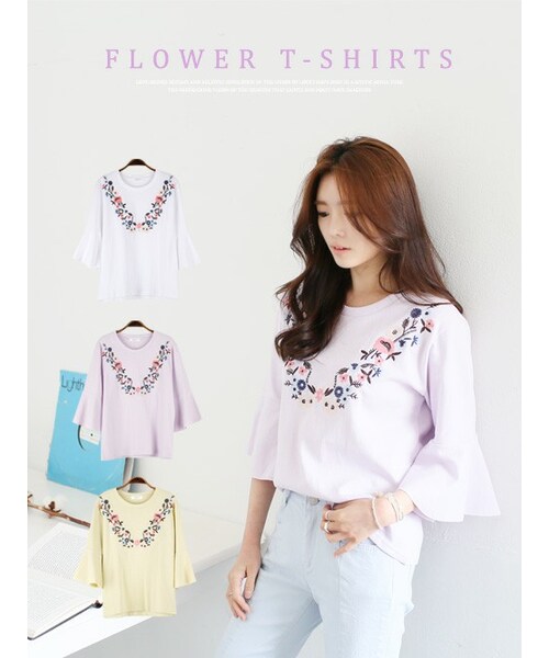 【高級感のある花柄の刺繍コットンtシャツ】袖のプリルと花柄の刺繍でさらに女らしくコーデ!若くコーデできるコットン素材Tシャツなのに大人しく刺繍されている!微妙に似合うデザインがお気に入り服となります