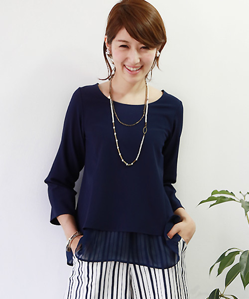 華やかだけど派手すぎない大人上品なトップスが出来ました! キレイめ生地と360度どこから見てもキマるデザインはオフィスでも、お出掛けでも活躍間違いなし★ 下からのぞく透け感のあるシフォンと表面のヴィンテージドビー生地のコントラストが絶妙。 どんなアイテムとも合う丈感で腰周りのカバーも叶えてくれるのが嬉しいポイント!! ピンクベージュとオフはデニムと組み合わせて可愛らしい春コーデに♪ フォーマルな場でも活躍する万能カラーのネイビーはタイトめなパンツやスカートと合わせてきれいめコーデに♪ ボリュームのあるボトムスの時はシフォン部分をウエストにインしてすっきり短めのトップス風にするちょっと変わった着こなしがオススメです!