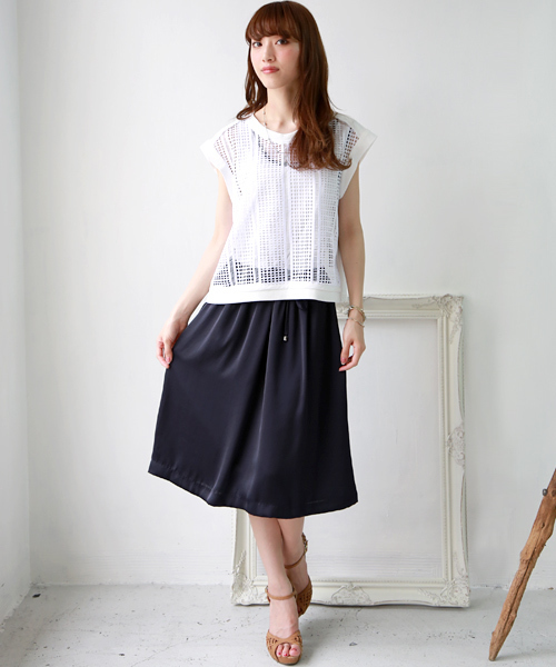 柔らかなメッシュ素材が爽やかなワンピース。 ワンピース部分はサテン切替のなめらか素材で艶感が大人のワンピーススタイルを演出♪ ウエスト部分がヒモ調節できるのでボディラインもきれいに見えます。 パンプスと合わせたきれいめコーデから、スニーカーを合わせたカジュアルスタイルまで 夏のお出かけにぴったりのアイテムです☆