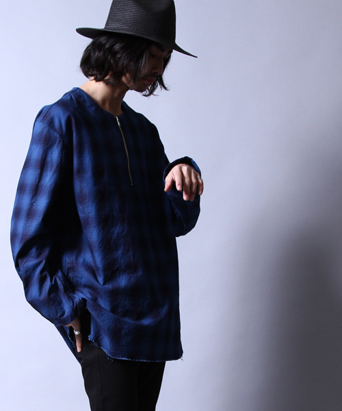 アメリカンラグシーオリジナルのインディゴチェックロングシャツです。 首元をジップキーネック仕様にし、裾をきりっぱなしにしたデザイン。 夏にはサンダルやワイドパンツでラフに着こなしていただき、春先や冬にはスキニー等の合わせでインナーに使用していただくことで幅広くご利用いただけます。 インディゴ染めされた生地は使用していくにつれ表情が出て来るので使い込んでいただけるアイテムです。