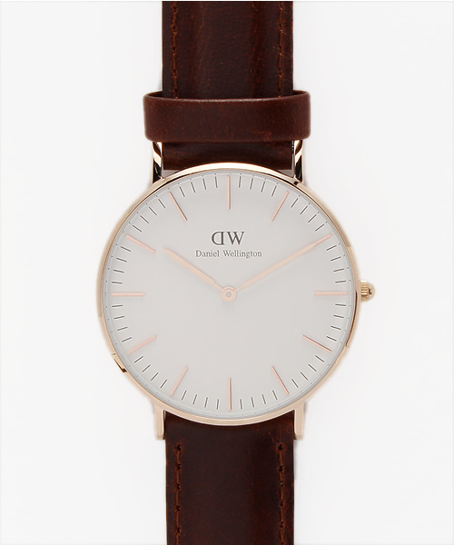 [DANIEL WELLINGTON(ダニエル・ウェリントン)] 2011年に設立されたスウェーデン発の腕時計ブランドです。ダニエル・ウェリントンの時計は現在、アメリカやスウェーデン、ノルウェーなど世界80カ国で取り扱われています。 シンプルで大きな文字盤に、薄いケース、好みに応じて付け替えられる豊富なカラーのNATOタイプベルト。 そんなスタイリッシュなデザインに加え、リーズナブルな価格も人気の秘密です。デザインバリエーションは大きく分けて、ラウンドフェイスにレザーを纏ったクラシカルなものと、NATOを使用したプレッピーなものの2つ。洗練されたユニセックスのデザインは、カジュアルからスーツスタイルまで、シーンを問わずフィットします。