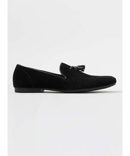 Star Adler black suedette loafers with black tassle detail and black collar trim, finished on a thin black PVC sole. 100% Suedette All sizes shown are for USA Color: Black Code: 97Y14KBLK