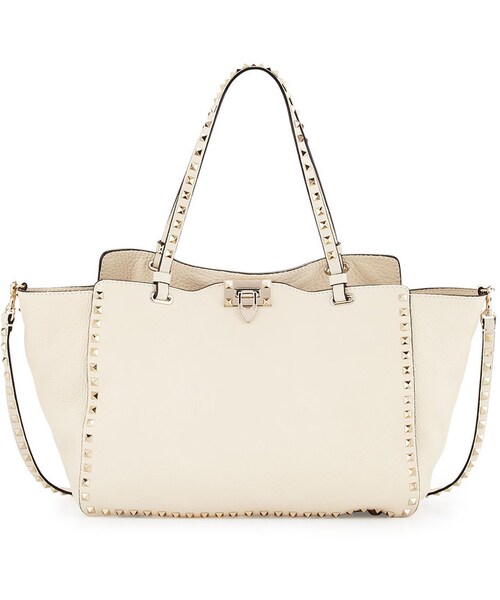 Valentino shoulder tote bag in grained vitello leather with platino hardware.Signature Valentino Rockstud pyramid studs frame front and back.Studded flat tote straps, 10" drop.Removable shoulder strap, 19" drop.Open top with flip-lock closure.Back foil logo.Interior leather zip panel; unlined.Metal feet protect bottom.10"H x 12.8"W x 5"D; weighs 2 lb. 4.8 oz.Made in Italy.