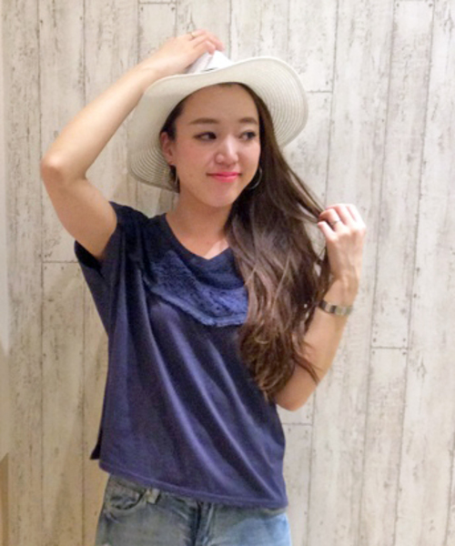 フリンジ×レースのディテール満載のデザインTシャツです! 身頃の生地と同色にすることでコーディネートのしやすさはそのまま☆ スタイリングに動きが加わるサイドスリット入り!