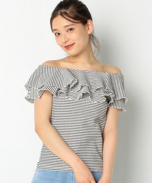 フリルボーダージャカードTシャツ☆ フリルを二重に重ねたボリュームのあるデザインながらも身頃はタイトな、メリハリのあるシルエットで仕立てました。 オフショルダーとしても着られるので、その日のスタイリングや気分に合わせた着こなしをお楽しみいただけます。 さり気なく表情のあるジャカード編みの生地と、爽やかなボーダーがポイントです。 ※着用、お取り扱いの際は商品についておりますアテンションタグ、洗濯ネームを必ずご確認ください。 店舗にお問い合わせの際は、全国のAnother Edition店舗まで 下記の品名/品番をお申し付け下さい。 品名:AEBFC フリル ボーダー JQ T 品番:56172993034