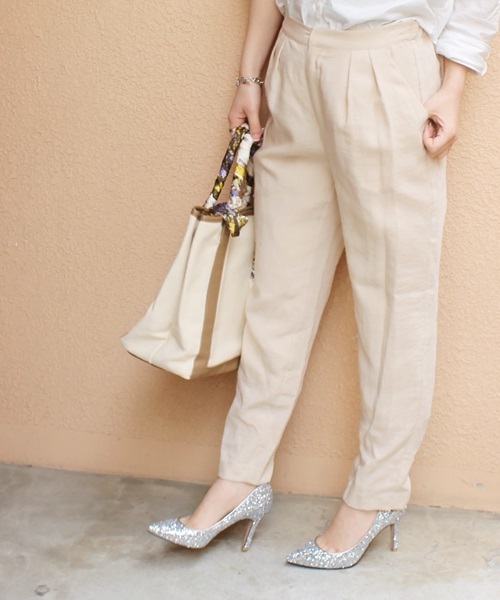 キレイでシンプルなラインが作れるタックパンツです。 柔らかい素材で着心地も良く、シルエットも綺麗で女性らしく着ていただける一枚。 カラーリングも爽やかなベージュ、サックスと大人なスタイリングにオススメのブラックをご用意。 セットアップでも着ていただけるので、スタイリングのバリエーションが広がるアイテムです。 ※セットアップで着ていただけるブラウスはこちら 商品コード:11871225 商品名:LINEN LIKE ツイストブラウス サックス着用スタッフ身長:165センチ 着用サイズ:38 ベージュ、ブラック着用スタッフ身長:154センチ 着用サイズ:38 ※店頭・外での撮影画像は、光の当たり具合で色味が違って見える場合があります。 商品の色味は、スタジオ撮影の画像をご参照ください。