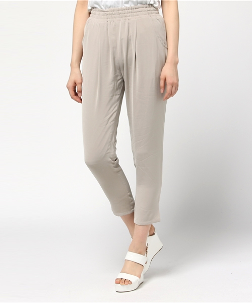 テーパードタイプのシャーリングパンツ。裾も8分ほどの丈ですっきりとした印象に。素材感に程よく光沢がありキレイめスタイルにはまりそう。ウエストはゴム仕様で楽に脱ぎはきすることができます。セットアップでご使用になれるノースリーブのトップスもご用意。Gジャンなどを羽織ってカジュアルに、ジャケットスタイルでちょっとしたお食事なんかにもぴったり。