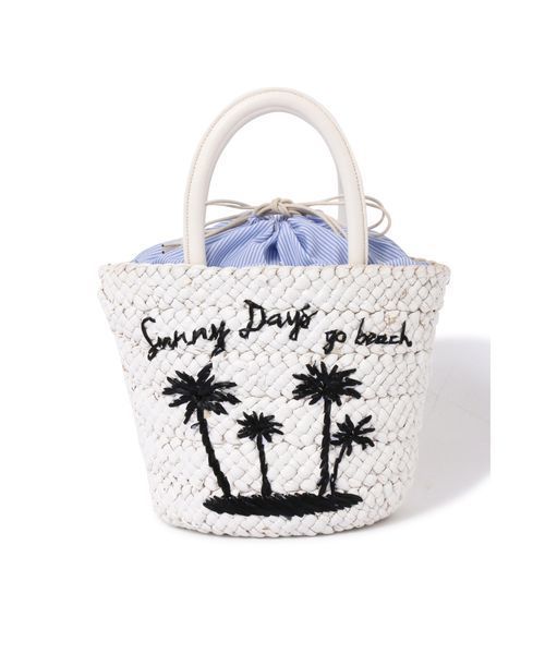 リゾート気分を盛り上げるバスケット。ホワイトベースに、パームツリーとロゴをONした都会リゾートなデザイン。内側は、ストライプの巾着で爽やかさがあり、キュッと絞る間口で中身の見えないところも魅力です。