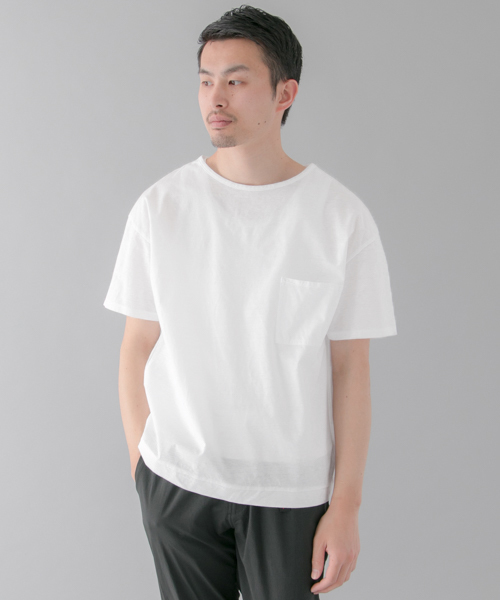 【MADE IN JAPAN ITEM】 その名の通り、パリっとした質感がおもしろい、ペーパーライクなコットン天竺素材のビッグTシャツ。 ドロップショルダー仕様で、ボリュームのあるシルエットでありながら、空気感のあるスッキリとした印象です。 胸元にはポケットを配し、シンプルなデザインにアクセントを加えています。 ※この製品は、製品洗いのため、色・サイズにバラつきがあります。あらかじめご了承ください。