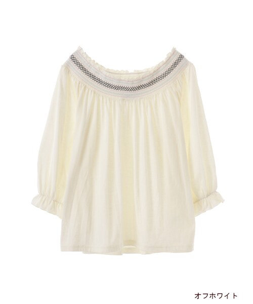 衿ぐりにぐるりと入ったスモッキング刺繍がアクセントのプルオーバー。袖口にゴムが入っているのでたくし上げてボリューム袖で着るのが可愛いです。トレンドのワイドパンツと合わせるボヘミアンコーデがおすすめ。