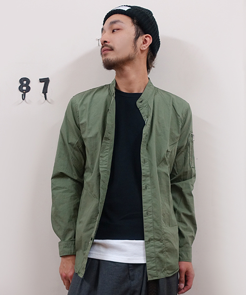 ミリタリームード漂うトレンドのバンドカラーシャツ。一見シンプルなバンドカラーシャツに見えますが、袖のユーティリティポケットがMA-1風のこなれたデザイン。コットン100%の着心地良い素材で、一枚着、インナー、羽織として重宝できるアイテムです。トレンドのミリタリーカラーが今年らしい表情の1枚。