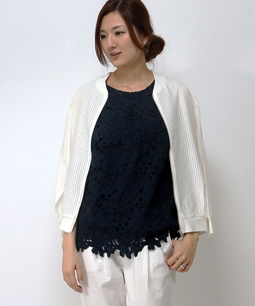 前身頃に華やかな総レースを貼ったノースリーブブラウス。レースのきれいな表情が際立つ大柄のフラワー模様が素敵です。マニッシュなワイドパンツを合わせて甘辛にするコーディネートも今年らしくて◎
