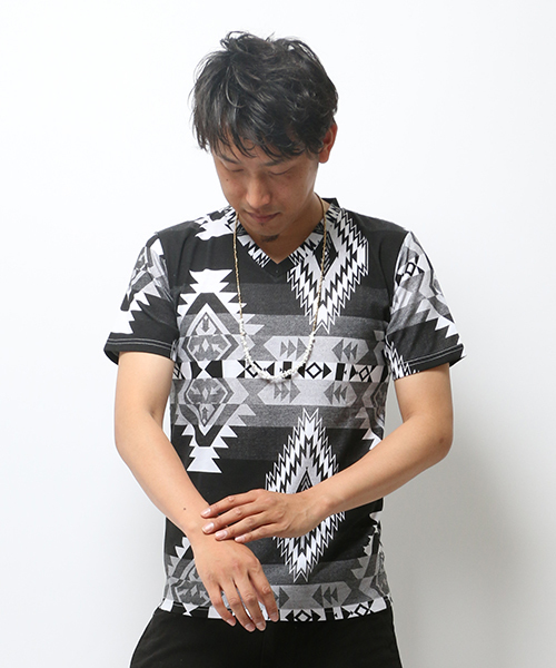 トレンドど真ん中のネイティブ柄を総柄にしたプリントTシャツ!デニムと合わせただけの王道スタイルも様になる抜群の存在感です☆軽装になるこれからの季節は、こんなヒトクセあるデザインをチョイスしてみるのも◎