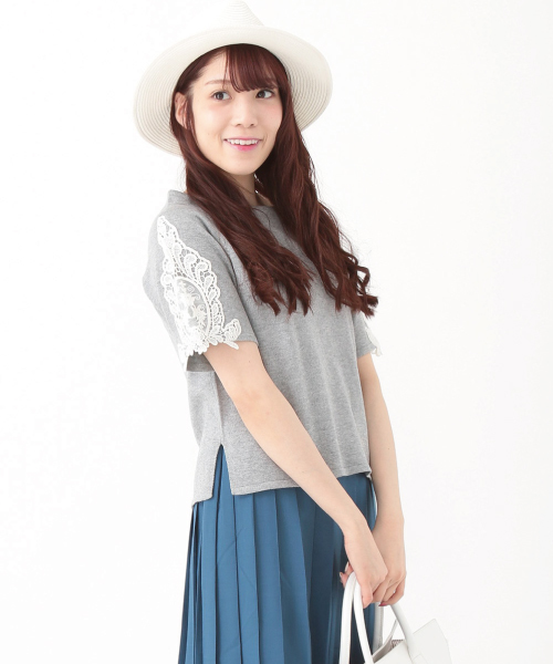 袖にモチーフレースの付いたラグランスリーブのプルオーバーです。綿素材を使った、ハイゲージの編地で仕上げています。5部袖丈なので気になる二の腕もすっきりと見せてくれます。袖に施したモチーフレースが女性らしいデザインです。スカートやガウチョパンツに合わせたスタイルがおすすめです。