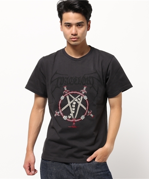 メタルバンドロゴを思わせるデザインのグラフィックをプリントしたTシャツ。 COTTON×COOLMAXのプレーティング天竺を使用したボディは、 高機能素材のような着心地とコットン素材ならではの表情を共存させています。