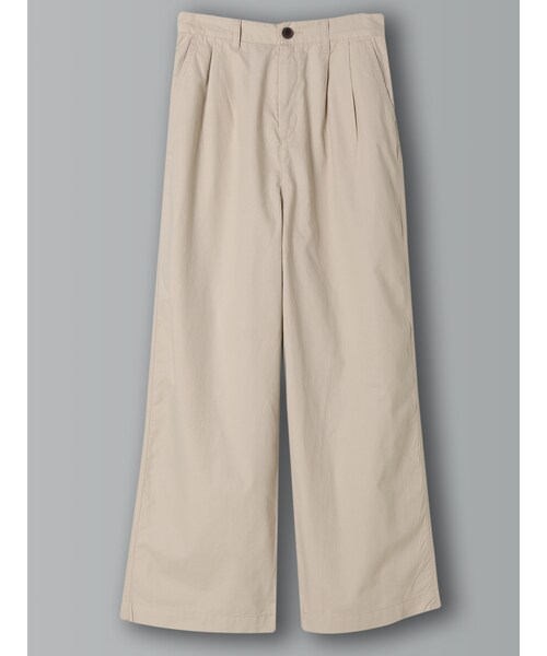 ボリュームのあるフレアシルエットが特徴的なワイドパンツ。フロントにタックを入れることで立体感を出しました。柔らかくシルエットがきれいに見える薄手の綿ツイル生地を使用しているので、女性らしい印象です。おすすめアイテム⇒クロップ丈トップス、Vネックトップス、レース使いトップス、ロングカーディガン、ジレ