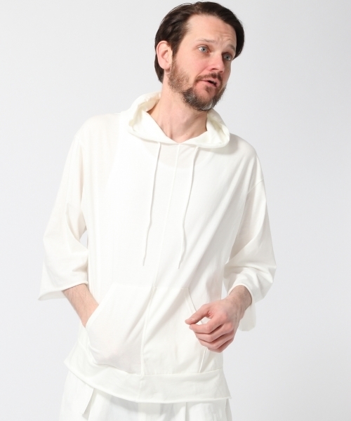 天竺生地で仕上げたカットプルオーバーパーカー。 フードは収まりがいいように小さめに、袖と裾はカットオフ仕様で、8分袖になっています。 非常に軽く、着易い作りになっており、ストレスを感じずに気持ちよく着れるアイテムです。 レイヤードコーデがし易いように裾は絞らず、スリットを入れた仕様に。