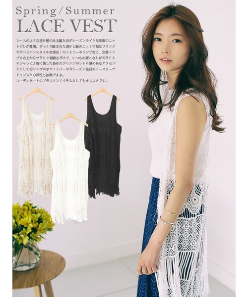 【フリンジニットジレ】レースのような透け感のある編み目がシーズンライクな印象のニットジレが登場。ざっくり編まれた透かし編みニットで裾はフリンジでボヘミアンスタイルを演出!