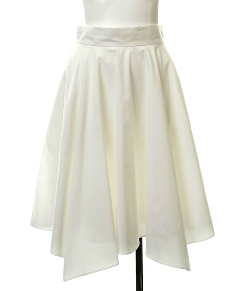 やや張りのある素材感と裾部分のアシンメトリーなデザインが印象的なフェミニンスカート♪