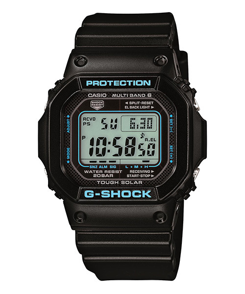 タフネスを追求し進化し続けるG-SHOCKから、ブランドカラーであるブラックをベースに、人気のブルーをアクセントカラーとして組み合わせた「ブラック×ブルー シリーズ」が登場。 ボディ・バンドには光沢感のあるブラックを採用。ベゼル上下の色埋め部や文字板の差し色に夏の空をイメージしたスカイブルーをあしらい、精悍でクールな表情に仕上げました。 ベースモデルには、シンプルなフォルムが人気の電波ソーラーを3モデル、ビッグケースを採用したコンビネーションモデルを2モデルラインアップ。カジュアルからストリートシーンまで活躍できるNewカラーシリーズの登場です。 ・ 世界6局(日本2局、中国、アメリカ、イギリス、ドイツ)の標準電波を受信し、時刻を自動修正するマルチバンド6 ・ タフソーラー 仕様 耐衝撃構造(ショックレジスト) 無機ガラス 20気圧防水 ケース・ベゼル材質: 樹脂 樹脂バンド タフソーラー(ソーラー充電システム) 電波受信機能:自動受信(最大6回/日、中国電波は最大5回/日)/手動受信、 ワールドタイム:世界48都市(29タイムゾーン、サマータイム設定機能付き)+UTC(協定世界時)の時刻表示、UTCダイレクト呼出機能 ストップウオッチ(1/100秒、24時間計、スプリット付き) タイマー(セット単位:1分、最大セット:24時間、1秒単位で計測) 時刻アラーム5本(1本のみスヌーズ機能付き)・時報 バッテリーインジケーター表示 パワーセービング機能(暗所では一定時間が経過すると表示を消して節電します) フルオートカレンダー 12/24時間制表示切替 操作音ON/OFF切替機能 ELバックライト(フルオートELライト、残照機能付き) フル充電時からソーラー発電無しの状態での駆動時間 機能使用の場合:約10ヵ月 パワーセービング状態の場合:約26ヵ月