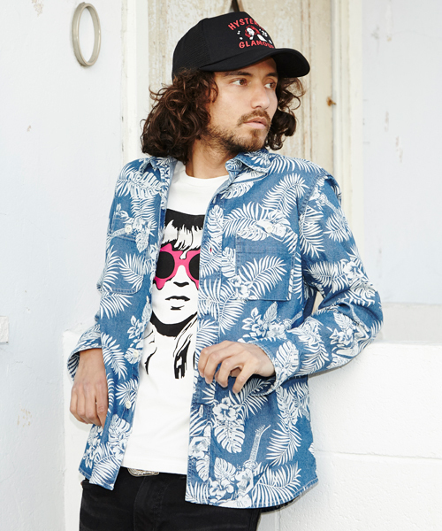 『南国のバカンスにもってこいなオリジナルアロハ柄のストレッチデニムシャツ』 薄手のストレッチデニムに、オリジナルのアロハ柄を抜染したワークシャツ。 南国でのバカンスにもってこい、なこちらのアイテムは編込みレザーのスリッポンなどを合わせれば、品の良さと適度なヌケ感が漂う大人のリゾートスタイルに。