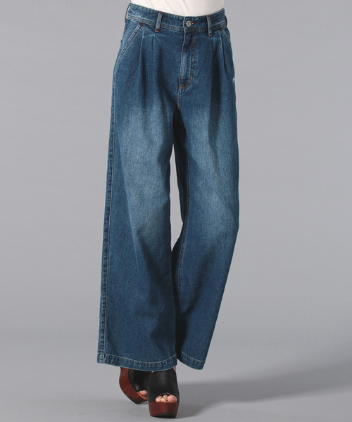 トレンド気分を盛り上げてくれるバギーデニムパンツ。春夏注目のレトロカジュアルなコーディネートにマストな一着です。ふんわりとしたシルエットにより、体型カバーとリラックス感のあるはき心地の両方を兼備。また、ハイウエストと、ボリュームのあるタックからストンと落ちるシルエットにより、足長効果への期待も高まります。程良いユーズド感が、あらゆるお洋服にもなじみ易く、コーディネートの幅が広い魅力的なデニムパンツです。