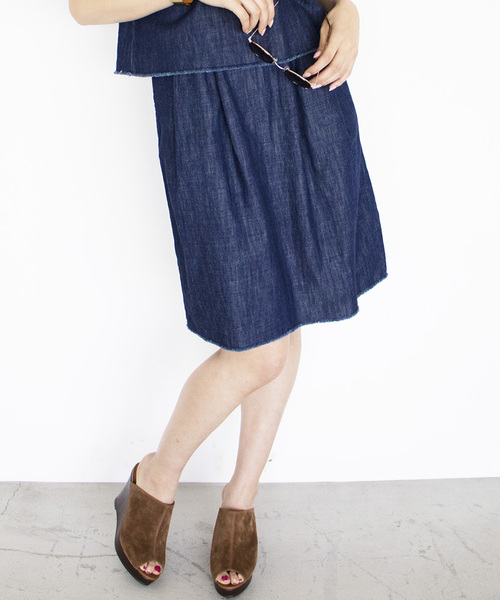 今っぽい!が、手に入るダンガリーセットアップスカート!ウエストゴムで穿きやすく、裾のカットオフや、長めの着丈が進化したダンガリーstyle。ギャザータックの緩やかなフレアバランスで、大人カジュアルに穿ける1枚。単品使いはもちろん、同シリーズのブラウスとセットアップがお勧めです。