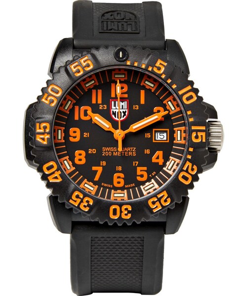 Luminox 's 'Colourmark' is the official watch of US Navy SEALs, making it a true performance timepiece. Cased in carbon-reinforced polyurethane and finished with a rubber strap, the durable materials mean this piece is always ready for action. The luminescent orange numbers and lettering and high water resistance are winning practical features.