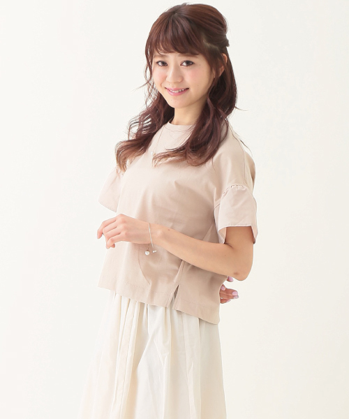 袖口をハリ感のあるタフタ生地に切り替えたドロップショルダーのプルオーバー。フワッと広がる異素材スリーブは二の腕をほっそりと見せつつ、愛らしい印象に。身頃の柔らかな綿素材にはシルケット加工が施されており、ほのかな光沢感で品良く着こなせるのも魅力。ゆとりを持たせたシルエットと、サイドスリットのヌケ感で気負いのないスタイルに。ワントーンのシンプルなルックスで着回し力の高い1枚は、ガウチョパンツやフレアスカートなどの旬ボトムとも好相性◎