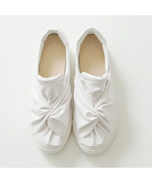 シンプルながらもひねりの効いたデザインの スニーカーをご紹介いたします。 リボンのような結び目デザインと、 ギャザーが入ったフロント部分が素敵☆ 履きやすく、デイリーユースにピッタリ! これからの季節に活躍しそうなスニーカーです。 また、デザイン性のあるスニーカーなので、 コーデのポイントとしても◎ですよ★ ◆COLOR : ホワイト、ブラック ◆SIZE : 23.0~25.0cm ◆モデル着用SIZE :ホワイト/23.0cm