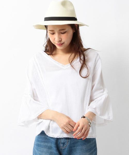 ガーゼヨウリュウVネックブラウス☆軽やかなヨウリュウ素材で涼しげな見た目のブラウス。袖に広がりを持たせたデザインと、レースの切り替えがアクセントになっています。首元は女性らしい開きにこだわり、スッキリとしたラインのVネックで仕上げました。デニムに合わせて着こなる事でボヘミアンチックな雰囲気に。今年らしいカラー展開もポイントです。※着用、お取り扱いの際は商品についておりますアテンションタグ、洗濯ネームを必ずご確認ください。アウトレット商品のご説明 ・お買上頂く全ての商品を発送前に規定の検品を実施しています。 アウトレット商品につきましては包装やパッケージに破損・汚れが見られる 場合にも商品に欠陥が認められない際にはそのままの状態でお送り致します。 ・注文取消し・返品・交換対象外商品となっております。 ・お取り寄せ・ご試着対象外商品となっております。