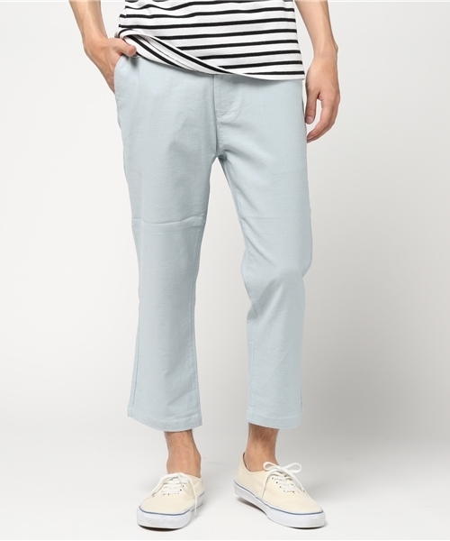 夏ボトムとして欠かせないクロップドパンツ。 ストレッチの効いた素材で快適な着用感があり、ウエストやポケット口などを部分的にリブに切り替えることでリラックスなムードを演出しました。 どんなスタイルにも似合うベーシックなデザインです。