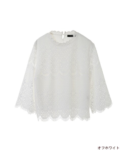 【mer 6月号掲載】繊細なスカラップレースがキレイなプルオーバー。衿ぐりまでレースがあしらわれています。この春トレンドのレーストップスは持っていたいアイテム。後ろボタン開きなので着脱も簡単です。今年は加工デニムのカジュアルアイテムを合わせるのもオススメ。※身頃のみ裏地が付きます。