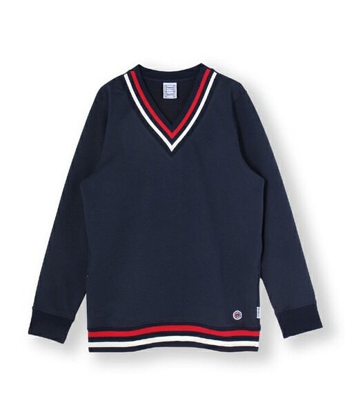 Reebok CLASSIC(リーボック クラシック)アパレル。BEAMSとのコラボレーションモデル。トリコロールカラーのリブ使いが特徴的なVネックスウェット。ボディサイドに施された隠しポケットのライニングには、トリコロール模様のパターンがプリントされている。春先のレイヤリングに活躍する1枚。