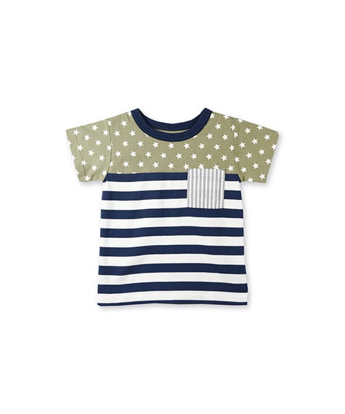 星プリントとボーダーの切替えTシャツです。胸元のサッカー素材のポケットもアクセントになっています。※80cmから95cmは、首もとがスナップボタン仕様となります。