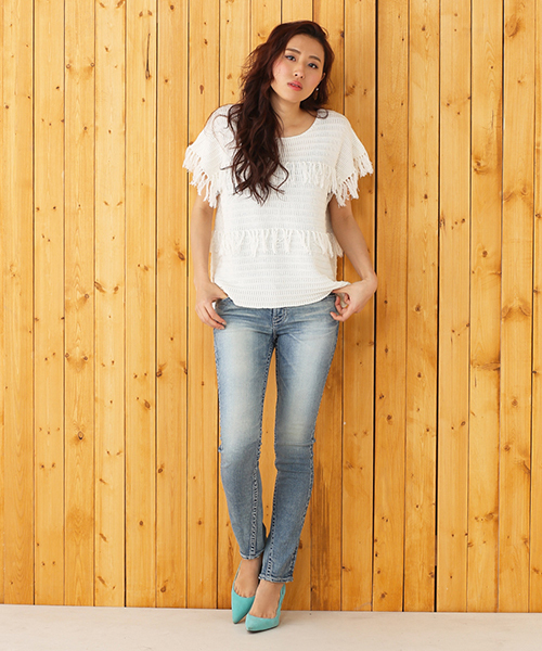 涼しげなライトブルーの色合いが、これからの季節にぴったりマッチするこちらのデニム。膝の部分の色落ち感など、長年穿きこんだようなビンテージライクな風合いが持ち味です。ボタン、リベットにはホワイトをセレクトし、ディテールにも爽やかさを散りばめました。ボリュームのあるレーストップスともバランス良く仕上がる、スリムなシルエット。見た目にはラフ感がありながら、しっかりフェミニンに穿きこなせる優秀な一本です