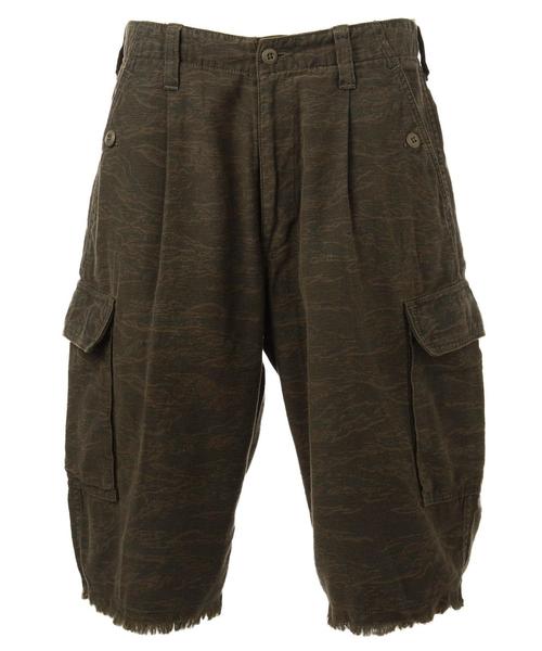 ヘンズリーパンツをカットオフしたようなデザインのショーツ。素材はタイガーカモ柄をプリントし、縫製後に再度オーバーダイを施して柄を馴染ませています。丸みのあるボリューム感とパッチポケットが存在感を主張。これからのシーズンにぴったりなラフで軽快なカジュアルスタイルをお楽しみいただけます。店舗にお問い合わせの際は、下記の品名/品番をお申し付け下さい。品名:SONS HENSLEY CUTOFF SRT 品番:5519-211-0079