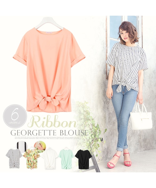 テロっとした落ち感と、フロントでちょこんと結ぶリボンのデザインが女性らしいジョーゼット生地のブラウスが登場!【素材・サイズ感】軽やかなジョーゼットで、夏にも着やすい素材が嬉しい。さらっとした肌触りで着心地○【スタイリング】抜け感あるコーディネートが実現します。パンツもスカートも合わせやすい丈感なので、ヘビーユース間違いなし。ラフすぎないオトナの上質コーデを完成させてくれます。◆MODEL(164cm:オフストライプ着)※キャンセル/変更不可【サイズ】ワンサイズ(M)【実寸(cm)約】●着丈…(前) 59 (後) 67●肩幅…45●胸囲…104●ウエスト…112●裾周り…102●袖丈…20●袖周り…44●袖口…34【素材】ポリエステル100%※【伸縮】なし/【淡色透け】若干あり/【濃色透け】若干あり/【裏地】なし