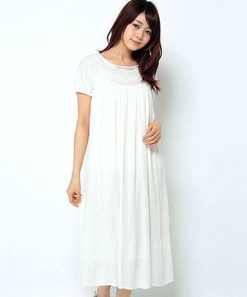 顔回りを華やかに見せるレース切り替えのワンピース。少しエスニックな雰囲気のあるこちらは、しなやかな着心地と落ち感が魅力のレーヨンクレープ素材を使用しています。ウエストマークできるリボンロープ付き。裏地有りです。