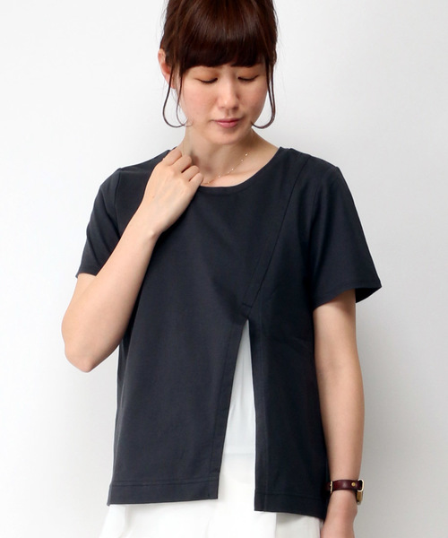 異素材使いがポイントになったフロントシャンのプルオーバー。大胆に入れたスリットからインナー生地が覗き、一枚でレイヤードしているような着こなしが楽しめます。テクニック要らずで様になるから、時短おしゃれにも一役買ってくれるアイテム。