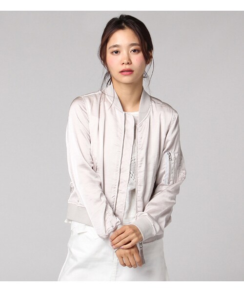 腕のシガーポケットや首元と裾のリブデザインがMA-1ブルゾンです。ミリタリーテイストのMA-1風ブルゾンですが、シャイニーで落ち感のあるサテン素材を使うことでちょっぴりフェミニンに仕上げました。ワンピースや今年らしいビスチェの上から羽織って甘辛MIXなおしゃれを楽しむのがおすすめ◎(モデル身長:161cm)