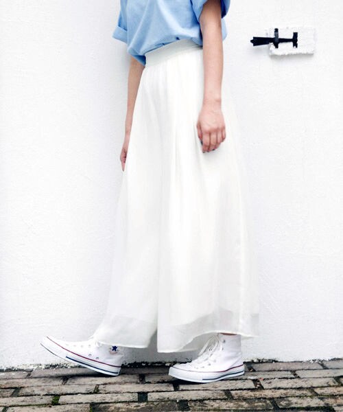今期マストアイテム!スカンツ今期大注目のスカンツ!ローリーズファームでは何種類かのスカンツを用意しております☆こちらはシフォン素材で作られたスカンツ。ワイドなデザインで動く度揺れるシルエットが女性らしいパンツです!淡い色味のカラーバリエーションになっているので、合わせやすさもGOOD。ショート丈トップスやTシャツをINして着て頂くのがオススメです♪