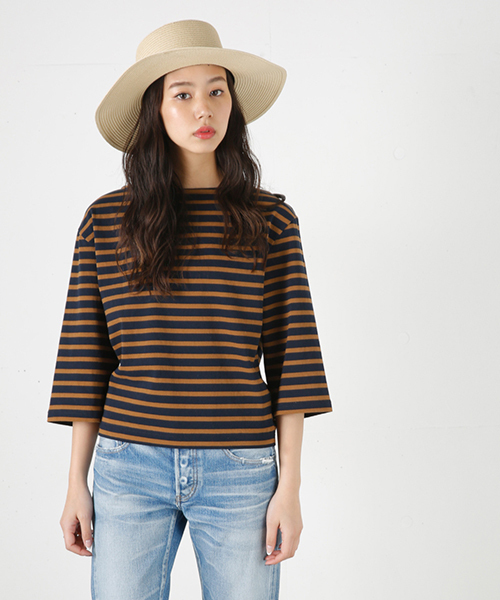しっかりめのコットン素材のボーダートップス。6分袖で袖口にかけて細くなっているのがポイント。ボートネックの開きもきれいです☆