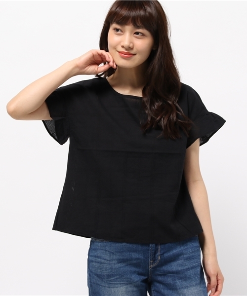 ギャザー袖がキュートなノーカラーブラウス。コットンドビーの着心地も◎ 一枚で着られて、サロペットなどのインに着てもかわいく合わせられます。