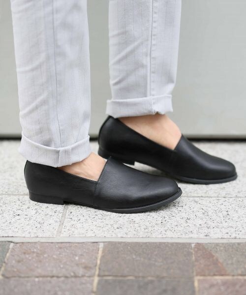 フェイクレザーを使用したスタイリッシュな印象のスリッポンシューズ。季節やスタイルを問わず使い回せるシンプルな万能なアイテム。きれいめなコーディネートはもちろん、カジュアルアイテムとも相性抜群です。流行に左右されずに使える定番シューズとして、是非ゲットして下さい。※相性の良いソックスもご用意しておりますので、是非ご覧ください。■ソックス一覧はこちら■