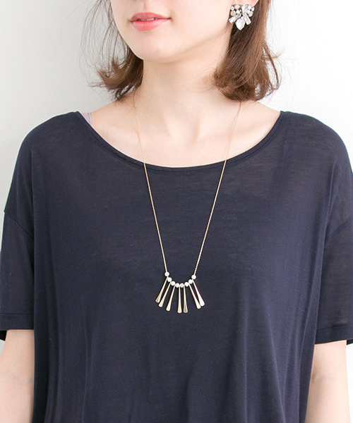 今年トレンドのフリンジがモチーフのロングネックレス。華奢なチェーンで女性らしさを残しつつ、トレンドのフリンジをさりげなく取り入れることができるデザインです。無地のTシャツや、ワンピースにプラスするだけで、オシャレの幅が広がり、天然石も夏らしく涼しい印象に◎