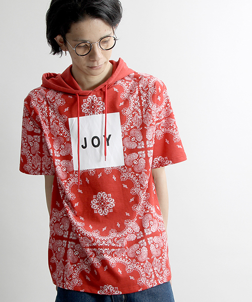 ペイズリー柄を落とし込んだフード付きTシャツ。フロントにあしらったロゴプリントも手軽に着こなしのアクセントになります。柔らかな生地の質感と、程よくゆとりのあるシルエットで着心地の良いひと品。一枚で着用頂くのは勿論、インナーとしてのアクセント使いもオススメ。男女問わずユニセックスでお使い頂けるので、ご自身用は勿論、プレゼントにもオススメです。