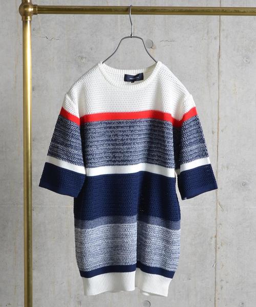 SHIPS JET BLUE(シップス ジェットブルー)のオリジナルニット 2色の糸でグラデーションや様々な編地の組み合わせでボーダーを表現したショートスリーブニット 緩めの編地と相まって非常に清涼感のある仕上がりです。 胸周りの細いラインを各カラーで差し色として異なった配色にしているのもポイント。 カットソーの上に着るのはもちろん襟ものとの組み合わせにもおすすめの一着です。 SHIPS各店へは下記品番にてお問い合わせ下さい。 126-02-0009