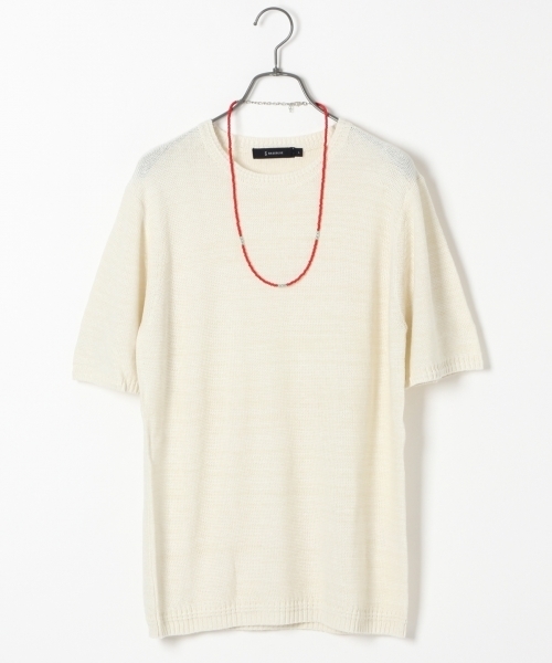 リネンとコットンを混紡した軽い素材の半袖ニット。 リネン特有の清涼感のある着心地とラフな素材感がこれからの季節にピッタリ。 ポイントとして、襟・袖・裾にタックを入れているので1枚で着てもサマになります。 ※撮影に使用しているインナー・小物は付属しません。